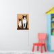 Poster en el ilustracion de un gato y gatito de inspiración moderna de mediados del siglo XX, negro y blanco, sobre un fondo dorado mostaza