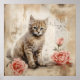 Un gato con rosas está sentado en un fondo marrón angustiado.