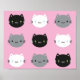 Gatos y gatitos kawaii negros, blancos y grises sobre un fondo bebe rosado.