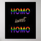 Poster dulce y gracioso, con el texto decorativo "HOMO dulce HOMO", una palabra por línea. Primero y último muestra letras mayúsculas en negrita rellenas con el símbolo gay, la bandera arcoíris. El "dulce" centrado está ligeramente anglonizado y puede ajustarse en función del color. También se puede personalizar el color de fondo sólido.