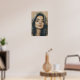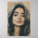 Este arte mural presenta un sorprendente retrato de una mujer cuya mirada segura llama la atención. Sus ojos azules agudos están enmarcados por cejas audaces y cabello oscuro, sutilmente salpicado de toques azules que le dan profundidad e intriga. La obra combina texturas como boceto con sombras realistas, dándole energía cruda y elegancia refinada. Con una expresión que irradia fuerza y aplomo, esta pieza captura la esencia de la autoseguridad y la individualidad, convirtiéndola en un punto focal cautivador para cualquier espacio.