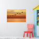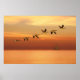 Se ve a seis gesos canadienses volando en formación contra un cielo atardecer. Están sobrevolando el agua y el oscuro contorno de un velero se ve en el horizonte.