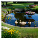Póster Geese en el estanque con flores y hierba