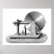 Dibujo del disco Faraday, el primer generador electromagnético, inventado por el científico británico Michael Faraday en 1831. El disco de cobre (D) giró entre los polos de un imán con forma de herradura (A), creando una posible diferencia entre el eje y la llanta debido a la ley de inducción de Faraday. Si se conectaba un circuito eléctrico como un galvanómetro entre los puntos de unión (B) y (B'), el movimiento indujo un flujo radial de corriente en el disco, desde el eje hacia el borde. La corriente fluye hacia el contacto del muelle (m) deslizándose a lo largo del borde del disco, fuera del punto de enlace (B') a través del circuito externo hasta el punto de enlace (B) y de vuelta al disco a través del eje. Si se gira en la dirección opuesta, se invierte la dirección de la corriente. La leyenda también dice que pasar una corriente desde una célula Bunsen (batería) a través de ella haría que el disco se girara, haciéndolo funcionar como un motor eléctrico. Las piezas etiquetadas se indican en la leyenda como: (A) induciendo el tornillo de enlace del disco inducido por imán (D) (B) para el tornillo de enlace del eje de disco (B') que entra o sale por la corriente para la entrada o salida de la circunferencia del disco (m) (contacto del muelle deslizante) para el borde del disco. La leyenda la describe como el aparato de Foucault y Le Roux, así que esta imagen no fue sacada de la máquina original de Faraday, sino de la del físico francés contemporáneo Léon Foucault. El disco Faraday fue un generador ineficiente porque las contracorrientes fluyeron hacia atrás a través de las regiones del disco fuera del campo magnético. Fue el primer generador homopólico