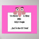 Un personaje de caricatura de aspecto loco con ojos abultados y una nariz grande que cuelga sobre un cartel que dice "El mundo está lleno de gente loca... y yo soy uno de ellos" El fondo está hecho de varios colores vivos que se pueden cambiar yendo a la opción de edición en la página de diseño una vez que se hace clic en "Personalizar" y se selecciona el fondo.