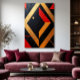 ¡abstracción geométrica energética! Diamantes y triángulos en negro, oro y rojo intenso, con texturas que añaden profundidad. Una explosión visual que mezcla el rigor matemático y la pasión cromática, ideal para los amantes del arte moderno que buscan contrastes audaces.