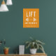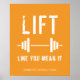 El diseño audaz y moderno incluye un brillante poster naranja con un icono de barbacoa y la cita "Lift Like You Mean It" en una tipografía en blanco angustiado. Personaliza tu nombre de gimnasio o borra si lo prefieres. Un elemento de decoración único para tu habitación, gimnasio o dormitorio