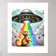 Un bonito ginger kitty da la bienvenida a un ovni que vibra con vigas de arco iris de color acuático en un prado de flores silvestres fantasía arte cifi generado por IA arte