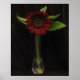 Este elegante poster cuenta con un bonito girasol rojo en un jarrón sencillo con algunas hojas verdes. El fondo es un paño de terciopelo negro profundo.