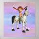 Pretty poster with an adorable little girl poser doll with flying pigtails / braids on a cute happy horse / pony on a beautiful pink and blue magical fantasy background with twinkling stars. Children will love these happy characters - a perfect gift for girls!