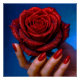 Dieses faszinierende digitale Kunstwerk zeigt eine Nahaufnahme einer glitzernden roten Rose, die sanft von einer Frauenhand mit passend rot lackierten Fingernägeln gehalten wird. Die mit Glitzer verzierten Blütenblätter verleihen der Rose eine magische Ausstrahlung und ein luxuriöses, glänzendes Finish. Die harmonische Farbpalette aus tiefem Rot und eisig blauem Schimmer vermittelt Eleganz, Geheimnis und moderne Weiblichkeit.