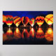 Globos de aire caliente iluminados en invierno en un lago congelado.