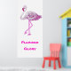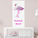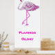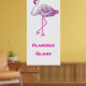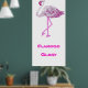 Dibujo mosaico, gráfico, de un pájaro tropical, flamenco, expuesto en colores exóticos, abstractos, de color rosa brillante, violeta, fuschi, marrón oscuro y negro, sobre fondo gris oscuro.