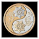 A yin yang symbol is adorned with intricate floral patterns and leaves. The design features a harmonious blend of gold and silver colors.