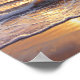 This is a serene and painterly depiction of a sunset over the ocean. The image captures the golden hour, with a bright sun descending and reflecting intensely on the water's surface, creating a sparkling path to the shore. Warm hues of orange, yellow, and soft pink dominate the sky and clouds. The foreground shows an active shoreline with waves breaking, rendered in beautiful detail with white foam and sea spray washing over the wet, sandy beach. Distant mountains or islands frame the horizon, adding depth. The style appears to be digital painting or oil/acrylic on canvas.