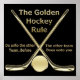 Face off with this ice hockey graphic design featuring gold crossed sticks and a puck. Text: Hockey’s Golden Rule about the other team. Be forward. Give this poster to a favourite player. No penalty