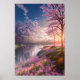 Un río tranquilo está bañado por el calor y la tranquilidad del sol, que se hunde suavemente por el horizonte. Flores rosas delgadas cubren la pacífica superficie del río, y árboles de flores de cerezo rodean ambas orillas, rindiendo homenaje silencioso. Todo el paisaje está bañado por un rico resplandor dorado que desprende un aire surrealista. Es casi imposible pasar por alto la tranquilidad y la tranquilidad del aire, que hacen que puedas disfrutar de la belleza de este momento de serenidad.