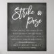 Si planeas un muro de fotos o una cabina de fotos en tu boda o fiesta de compromiso, ¡este cartel es para ti! Colóquelo junto a sus accesorios para que los huéspedes sepan qué hacer. Diseño de estilo vintage moderno en blanco y negro con "Strike a pose" (en blanco y negro) escrito a mano con algunas líneas de rima que dirigen a los huéspedes, sobre un fondo de pizarra cepillado. Personalice su nombre y fecha de boda y agregue una etiqueta boda opcional para que los invitados la compartan en las redes sociales.