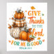 Diseño pacífico y colorido que presenta una hermosa escena otoño/otoño con calabazas decorativas apiladas y hojas otoño. El colorido texto inspirador dice: "Den gracias al Señor por ser bueno. Salmo 136:1". Este diseño está disponible en una amplia variedad de productos.
