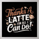 Este poster lúdico presenta la frase "¡Gracias a Latte por todo lo que puedo hacer!" en una tipografía audaz y elegante con un diseño inspirado en el café. Decoradas con granos de café, corazones y una taza de arte de café con leche, las obras de arte mezclan el humor y el calor, lo que lo hace perfecto para los amantes del café. Su ingenioso juego de palabras y su acogedora estética lo convierten en una pieza ideal para las cocinas, cafés o como un regalo alegre para alguien especial.