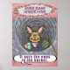 Este diseño tiene derechos de autor. Este gracioso poster de Pascua muestra a un personalizado de conejo conejo asustado atrapado en un agujero con huevos. Se está bajando una cesta colorida sobre una cuerda. El texto de arriba dice: "Película de horror de conejo de Pascua". La cita de abajo, que dijo un hombre malo no visto, dice, "pone los huevos en la canasta". Si te gustan las películas clásicas de horror / las películas criminales y el humor de la parodia / la sátira, este es el poster de Pascua que estás buscando.