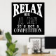 Divertido poster con texto blanco sobre fondo negro. El texto dice: "Relájate, estamos todos locos. No es una competencia". Ideal para dormitorios, habitaciones o incluso tu oficina. Contáctenos para obtener productos coincidentes.
