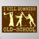 Los niños de hoy podrían matar zombis con pistolas, explosivos o láser futurista, pero ¿dónde está la diversión en eso? Bueno, eso es bonito divertido, pero no es tan emocionante como sacar el viejo bate de béisbol y el hacha. Este diseño retro se trata de matar/cazar zombis en la vieja escuela. Muestra la silueta de un hombre no muerto con los brazos extendidos. Delante de él, una señora anticuada blande un hacha sobre su cabeza. Y detrás de él, un hombre que se parece a Lincoln le da una paliza a un murciélago en su cerebro. El texto dice: "Mato a la vieja escuela de Zombies". Este es un diseño humorístico para cualquiera que disfrute de la matanza zombie clásica.