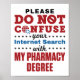 Gracioso regalo para farmacéutico. El diseño dice: "Por favor, no confundas tu búsqueda en Internet con mi grado en farmacia".