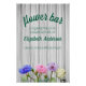 Garden party graduation with pink and white roses as well as blue and purple wildflowers.