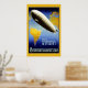 Es un afiche vintage de un dirigible llamado el Graf Zeppelin. En el fondo, un mapa que tal vez muestre la ruta del bache, desde Europa a Sudamérica. Colores brillantes.