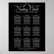 Haz que tu recepción de bodas sea hermosa con esta tabla de asientos de 9 mesas. Diseñado como parte de nuestra suite Relieve metalizado plateado Elegant Wedding, cuenta con un diseño sencillo y elegante con texto gris plateado sobre un fondo negro con un Relieve metalizado falso plateado con un borde floral. Este gráfico muestra asignaciones de tabla para 90 invitados.