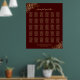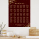Este bonito cuadro de asientos boda presenta un diseño sencillo y elegante con fondo de color marrón chocolate o auburn, Relieves metalizados de imitación dorados o fibra floral en las esquinas y un título de caligrafía con guión que dice "por favor, encuentre su mesa". La tabla tiene asignaciones para 300 personas en 30 mesas (10 asientos por mesa).