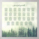 Esta rústica tabla de bodas de 27 mesas presenta una escena montañosa con un bosque de pinos verdes envueltos en niebla o niebla. El título dice "por favor, encuentra tu mesa" en elegante caligrafía de escritura de encaje. Hay espacio para los nombres de las parejas y la fecha de boda. Esta tabla tiene capacidad para 270 comensales en la disposición de asientos tradicionales de 10 personas por mesa.