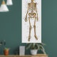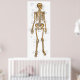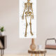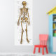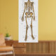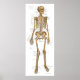 Poster anatómico del esqueleto humano. Vista anterior de los huesos del cuerpo con ligamentos y tendón de las articulaciones. Huesos y suturas del cráneo. Huesos y ligamentos de la mano, el pie, el hombro y la pelvis.