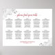 Esta carta de asientos ayudará a los huéspedes a encontrar las mesas que se les han asignado en la recepción de su boda. El diseño es sencillo pero elegante, con un fondo blanco y gris oscuro y un texto rojo. El título está escrito en bellas letras de caligrafía de escritura y dice: por favor, encuentre su mesa. Moda, bonito y sofisticado con florido de encaje floral imitación Relieve metalizado de plata en las esquinas. Tiene capacidad para 10 mesas con capacidad para 10 personas por mesa o 100 invitados.