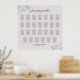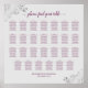 Esta bonita tabla de bodas tiene capacidad para 27 mesas con capacidad para 10 personas por mesa o 270 comensales. Presenta un diseño sencillo pero elegante con texto color morado o ciruela magenta sobre fondo gris y un diseño de imitación de color Relieve metalizado de plata en las esquinas. El título está escrito en sofisticada caligrafía de guión y dice: Por favor, encuentre su mesa. Elegante y refinado.