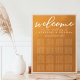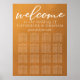 Este gráfico de asientos de boda dorado rústico con 16 mesas presenta tipografía blanca elegante superpuesta en un gradiente de tono terroso discreto. Los tonos simples de naranja claro y marrón siguen las tendencias actuales de otoño para una boda bohemia este otoño. Completa el look con tu letra script minimalista sobre este cartel de bienvenida con degradado de color.