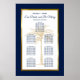 Añada su toque especial a este elegante diseño con escritura moderna y texto azul marino, incluyendo una silueta artística de palmeras doradas con un marco de oro metálico. Este diseño de la gráfica de asientos incluye los nombres de la novia y el novio, junto con las palabras "Come, bebe y sé moro" y "Encuentra tu asiento". Se proporcionan plantillas para un máximo de siete tablas con un máximo de 8 ó 9 nombres por tabla.
