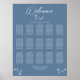 Este diseño presenta un gráfico de asientos de bienvenida de boda floral, un número de mesa de asientos de invitados nombre, una escritura de caligrafía elegante y de moda, una fuente tipográfica caprichosa texto, un cartel de bienvenida de boda de recepción, una decoración de recepción de boda moderna y elegante, un follaje de vegetación botánica, con un tema de color azul verdadero crepuscular, un fondo azul simple con texto blanco, para cartel de gráfico de asientos de recepción de boda