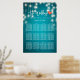 12 Tablas Boda Plantillas de Poster de la tabla de asientos - Elegante guión de letras y luces de cadena vintage con fondo de espuma de Purpurina azul turquesa. Un diseño perfecto para tu gran día. Todos los estilos de texto, colores, tamaños se pueden modificar para adaptarlos a sus necesidades.