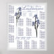 Tabla de asientos de iris azul bonito para bodas o cualquier evento fino. Quince cuadros de ocho personas junto con listas de mesas de novias.