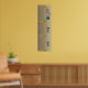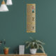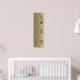 Las muñecas marcan el crecimiento del niño. Gato de 1 a 2 pies, perro de 2 a 3 pies y chica de 1 a 5 pies. Medir el crecimiento del niño en base a un fondo de textura beige. Líneas amarillas a 2 pies (medida desde el suelo), 3, 4 y 5 pies. Pulgadas marcadas entre líneas como 1,2,3,4,5,6,7,8,9,0,1,2 (en línea amarilla).