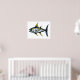una obra de arte decorativa de un gran atún con aletas amarillas y azules nadando a lo largo del día. un gran diseño para los aficionados al marisco y a la pesca.