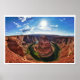 Hermosa fotografía de Horseshoe Bend, un giro en el río Colorado dentro del Gran Cañón visto desde arriba. Por encima del cañón, el sol brilla en un cielo azul con espíritus de nubes blancas.