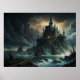Entrar en un mundo de obscuro encanto con este gran ilustracion gótico del castillo, que representa un majestuoso castillo encaramado sobre acantilados escarpados, rodeado de turbulentas olas y ominosas nubes de tormenta.