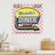 Crea tu propio personalizado, poster de pared de señas de estilo de los años 50 usando esta plantilla sencilla. Estos geniales posters retro tienen un fondo a cuadros rosados y blancos un poco angustiado con un cartel en la parte superior que dice "DINER" y "ABRIR" en neón con espacio para que agregues tu propio nombre o apellido - o cualquier otra palabra que quieras. El cartel también tiene una flecha iluminada y espacio para que añadas un lema y el año en que se creó tu cena, cocina casera o barra de temas de los años 50 (o el año en que tu fiesta está detenido). Todo en tonos rosas, blancos, negros, azules, amarillos, grises y rojos. Simplemente rellene la plantilla de fácil acceso o haga clic en "Personalizar" si su texto se ejecuta durante mucho tiempo y necesita cambiar el tamaño, reorganizar o cambiar los colores y tipos de letra del texto. No olvide elegir el tamaño del poster que desee (las formas cuadradas funcionan mejor para este diseño).