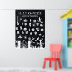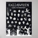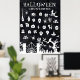 Póster de cuenta atrás de Halloween. El ejemplo es un diseño grande de 30x40 pulgadas con 31 días del calendario que puedes tachar o marcar a medida que pasa cada día durante octubre. Con diferentes ilustraciones que incluyen arañas, calaveras, gatos, escobas de brujas, pociones, velas, murciélagos, calderos, fantasmas, un cementerio y un árbol espantoso con cara.