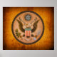 Un águila calva agarra una rama de olivo y trece flechas, en su seno un escudo, en su pico un cartel con el lema "E Pluribus Unum", y encima un cóctel con trece estrellas enmarcado por nubes.