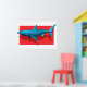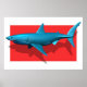 La cabeza del gran tiburón blanco sobre fondo rojo y blanco.