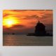 Shot in Grand Haven, Michigan, this is a photo of the end of the pier and the last building with the sun setting off in the distance. Silhouettes of boats coming back off Lake Michigan can be seen on the horizon.